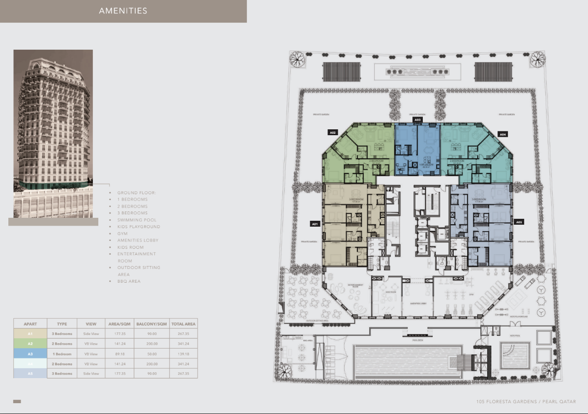Floresta Gardens offers a harmonious blend of privacy and connectivity. Located within The Pearl-Qatar, you’re just minutes from luxury retail, gourmet dining, and marina access. Whether it’s a morning jog along the waterfront or an evening stroll in the serene surroundings, Floresta 105 promises a lifestyle of convenience, elegance, and sophistication.